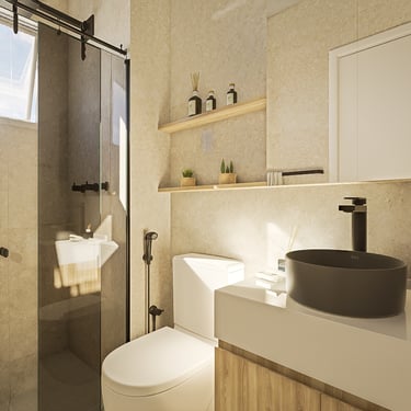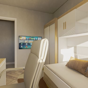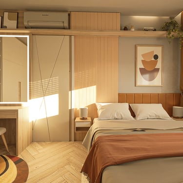 Na área íntima temos um quarto de hóspedes resolvido com móveis soltos, enquanto no dormitório da suíte temos um trabalho em marcenaria planejada.
