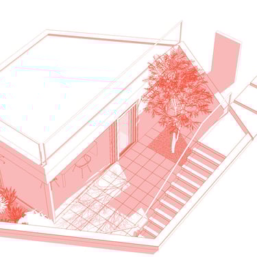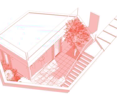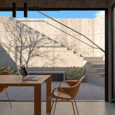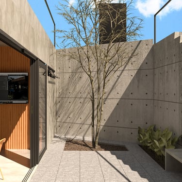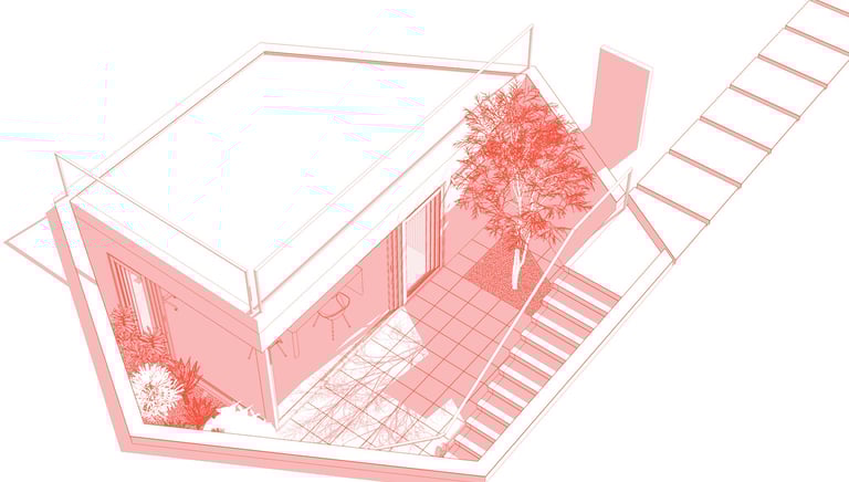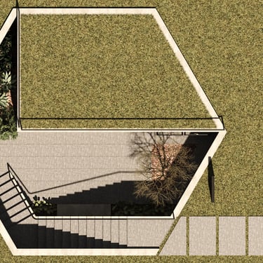 O ponto de partida do design foi um exercício de imaginação para responder à pergunta “Como seria uma edificação sem fachada?” - esta característica tão elementar a qualquer construção: A face do edifício, aquilo que se vê a partir do exterior. A rigor a fachada existe, mas está invisível para o observador, que para acessá-la precisa de fato entrar e, no percurso, observar a arquitetura. Caminhar por ela e ver a construção se revelando aos poucos a cada degrau descido. O sistema construtivo escolhido foi o concreto monolítico, pela sua resistência e acabamento que dispensa pintura ou revestimentos. O corrimão e guarda-corpo do terraço-jardim tem um desenho minimalista para pouco interferir visualmente. Todo o mobiliário interno é em MDF de acabamento amadeirado.